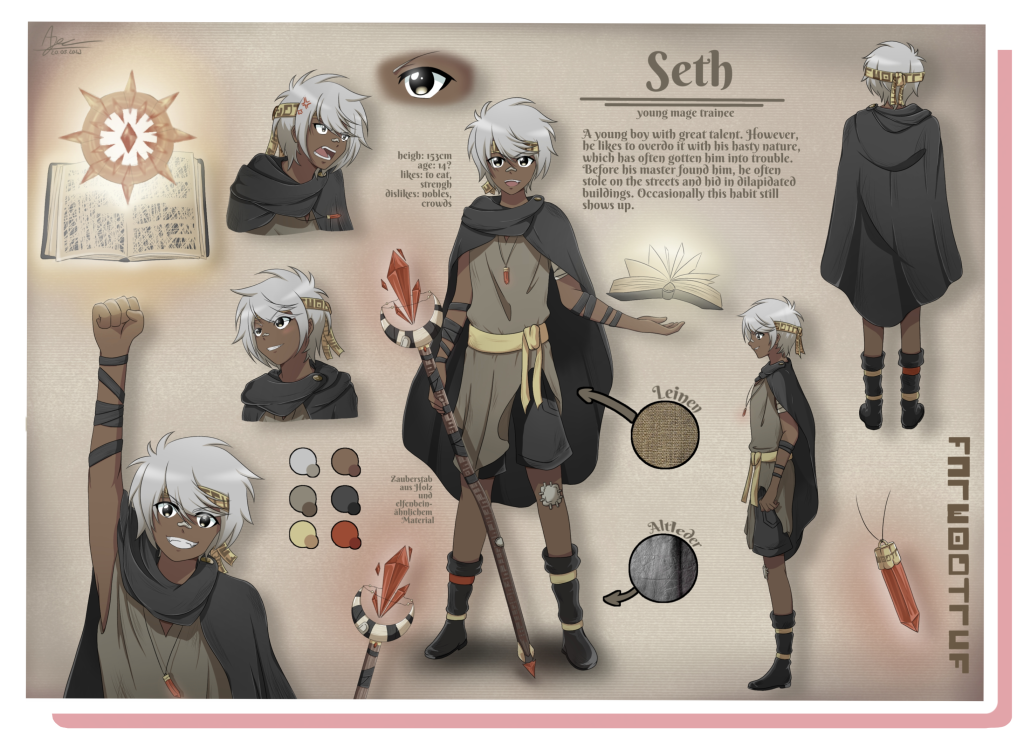 I will create you a detailed Character Sheet for a perfekt View over your character. This includes front, back and side view, some facial expressions and a colour palette.